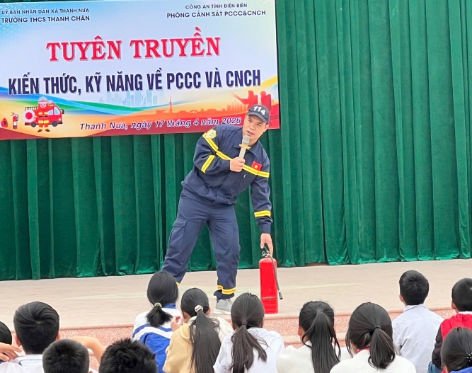 Thực hiện kế hoạch phối hợp giữa nhà trường và Công an tỉnh Điện Biên về công tác tuyên truyền, giáo dục pháp luật, Trường THCS Thanh Chăn rất vinh dự được đón tiếp các đồng chí cán bộ, chiến sĩ Phòng Cảnh sát Phòng cháy, chữa cháy và Cứu nạn, cứu hộ tỉnh Điện Biên về tổ chức buổi tuyên truyền, hướng dẫn kỹ năng PCCC và CNCH cho tập thể cán bộ, giáo viên, nhân viên và học sinh trong nhà trường.